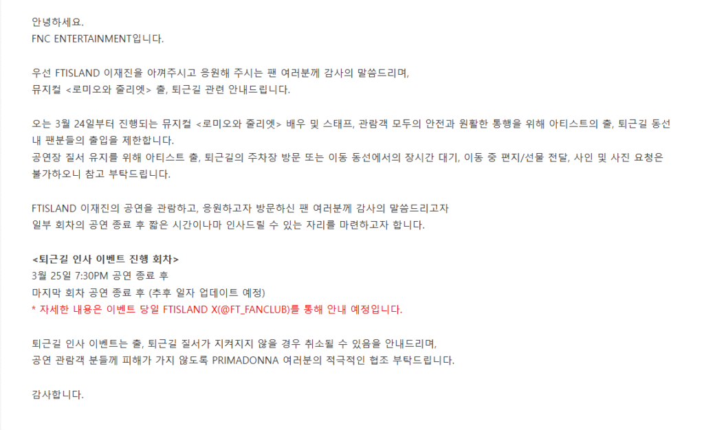 FTISLAND イ・ジェジン出演ミュージカル『ロミオとジュリエット』に関し、出退勤時の対応ルールとイベント実施について公式案内が公開された。